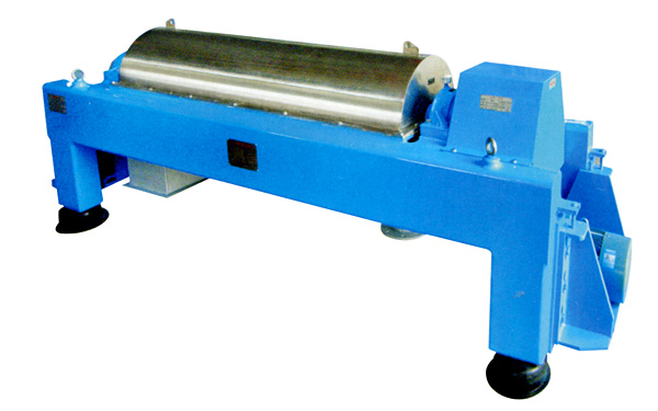 無孔轉(zhuǎn)鼓內(nèi)套裝有目心的卸料螺旋,兩者高速同向旋轉(zhuǎn)的同時,又具有一定的轉(zhuǎn)速差,該轉(zhuǎn)速差由傳動系統(tǒng)及差速器產(chǎn)生。懸浮液由進料管進入輸料螺旋內(nèi)腔。經(jīng)加速后進入轉(zhuǎn)鼓內(nèi),在離心力的作用下,密度較大的固相顆粒物沉降到轉(zhuǎn)鼓內(nèi)壁,形成沉渣環(huán)層,并被卸料螺旋不斷送到轉(zhuǎn)鼓小端而排出轉(zhuǎn)鼓外,澄清的液體不斷從轉(zhuǎn)鼓大端的溢流口排出轉(zhuǎn)鼓外,從而實現(xiàn)懸浮液的固體分離。